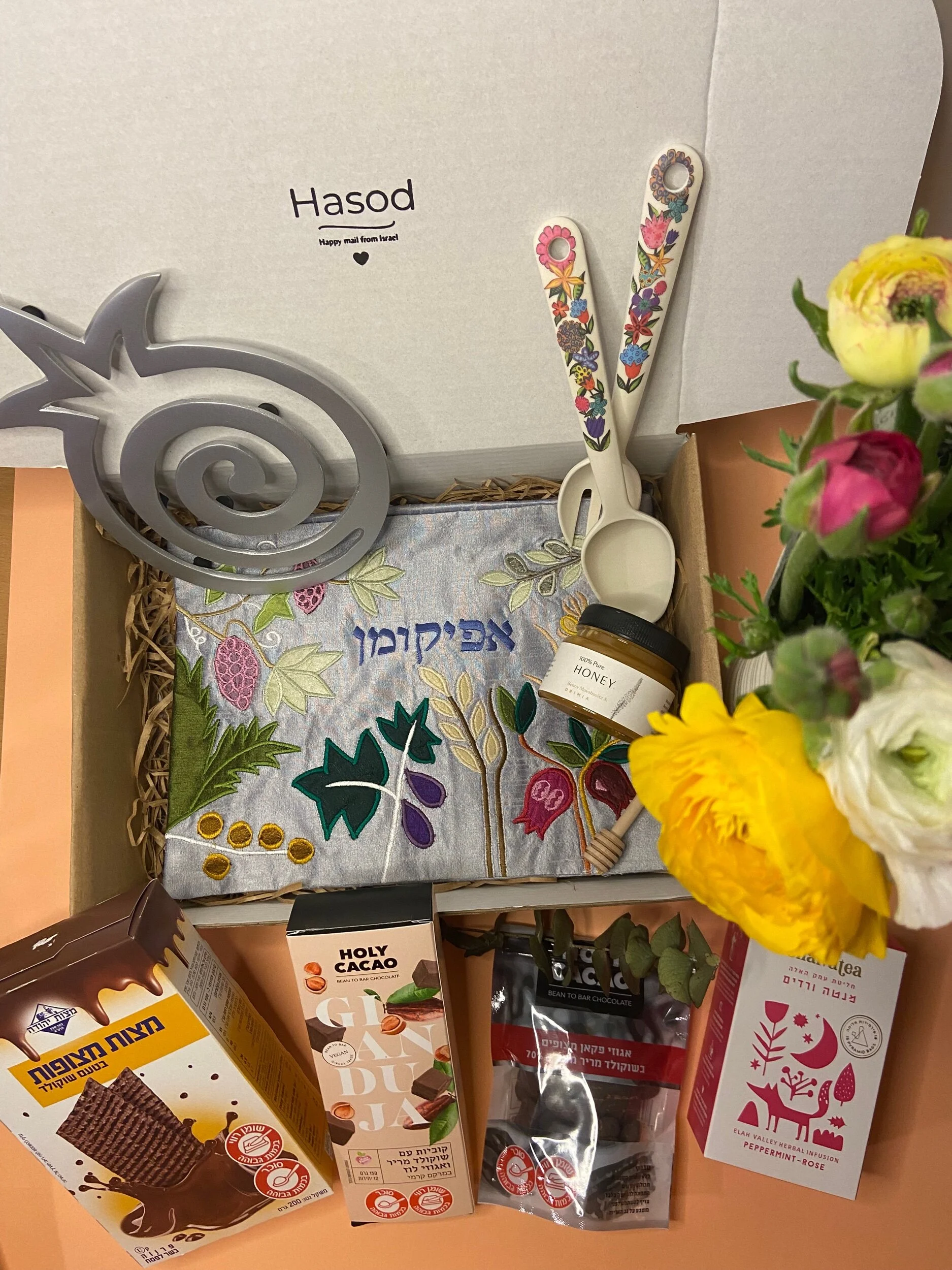 A pomegranate trivet, flowery salad spoons, an afikoman cover, 3 kosher for Passover treats, tea and organic honey.
